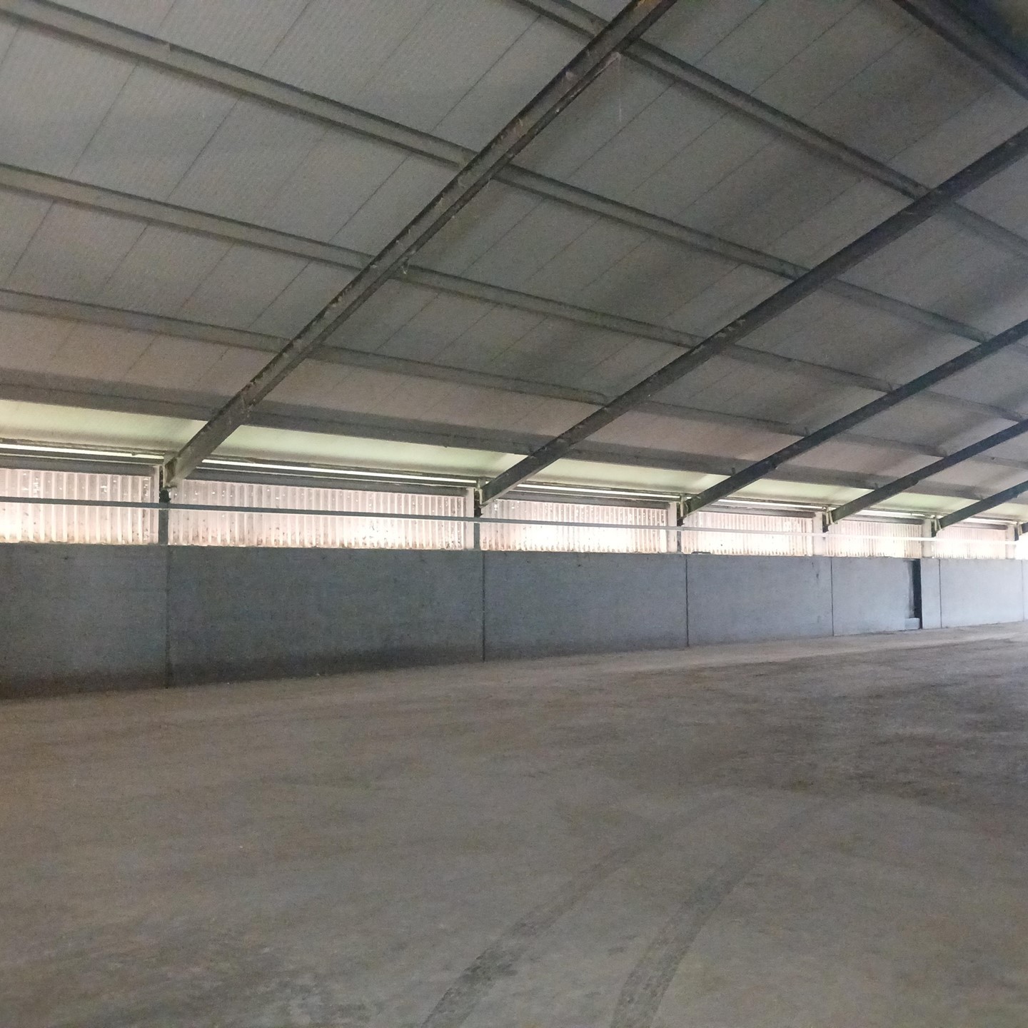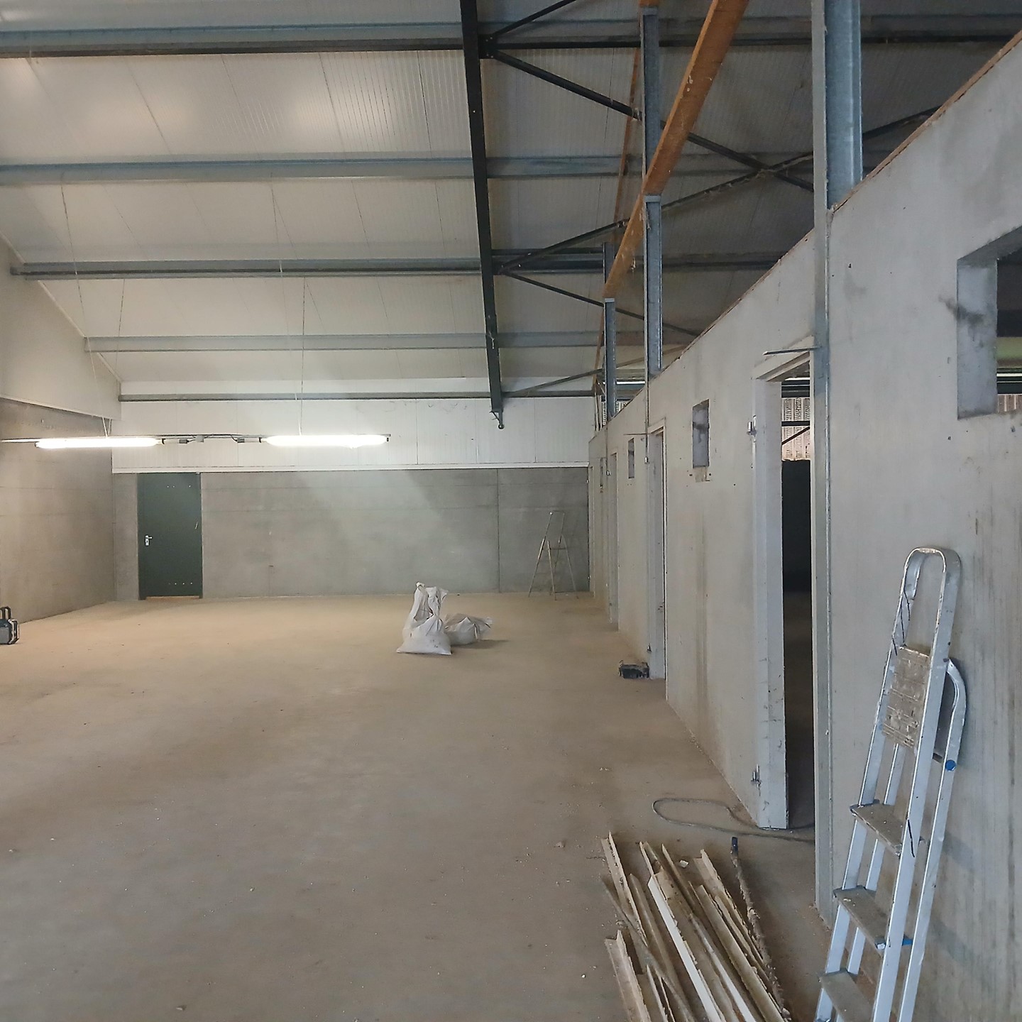1x Multifunctionele bedrijfsruimte, gelegen aan de doorgaande weg, grootte ca 2.092 m2, (afmeting 22,50 x 93 meter), vrije overspanning, geïsoleerd met 6 cm sandwichpanelen met een aparte ruimte voor het inrichten van een kantoor of werkplaats ca. 160 m2.