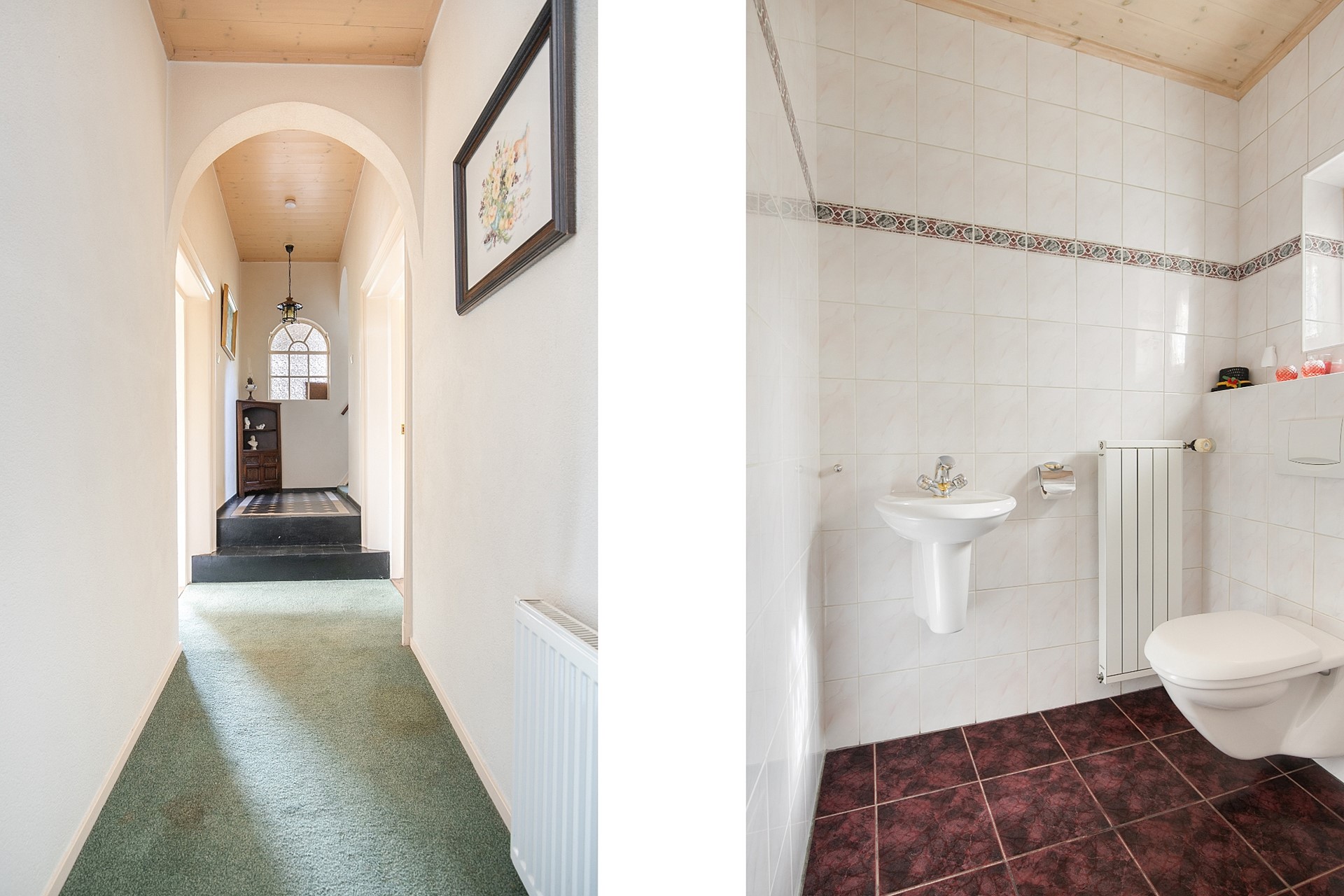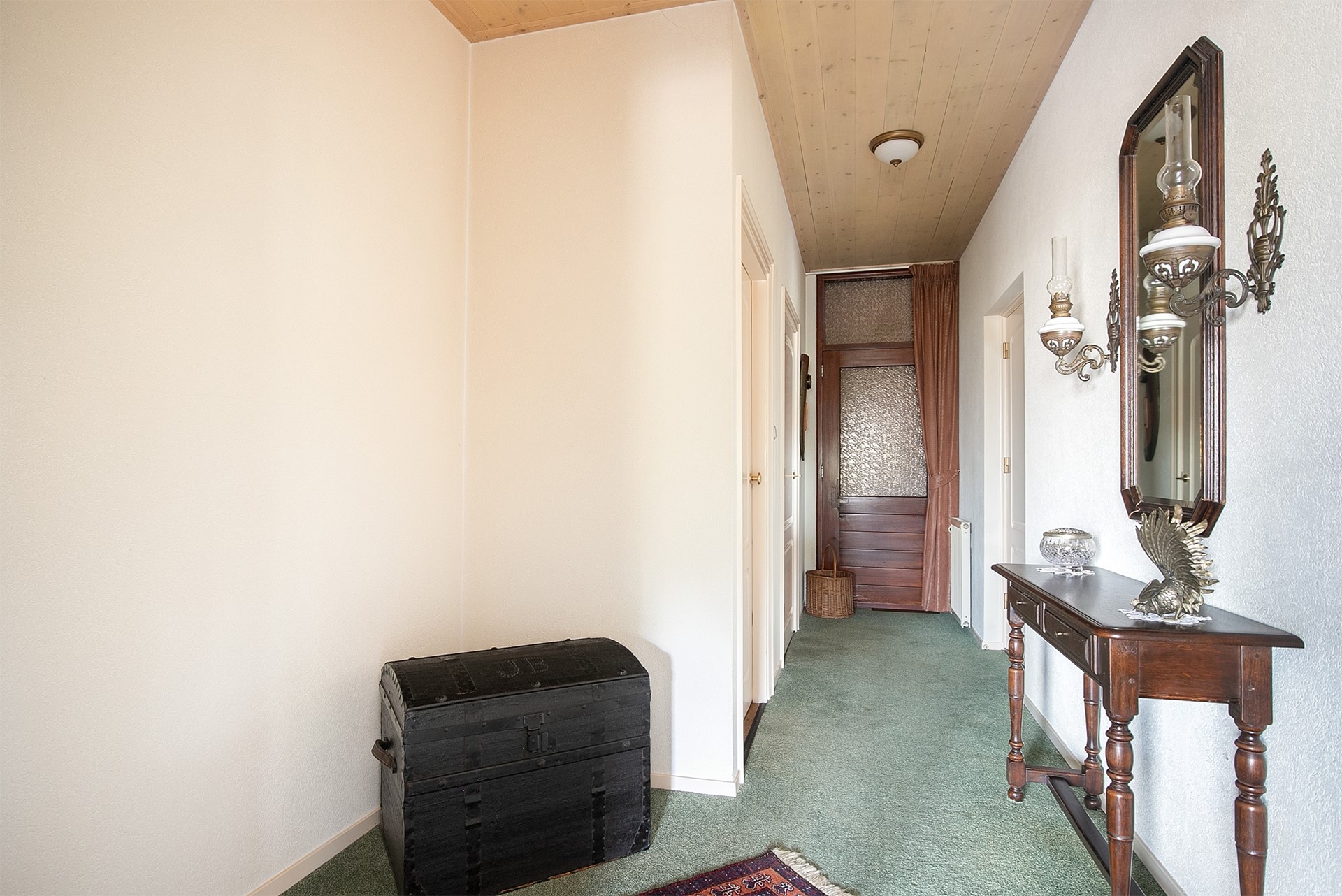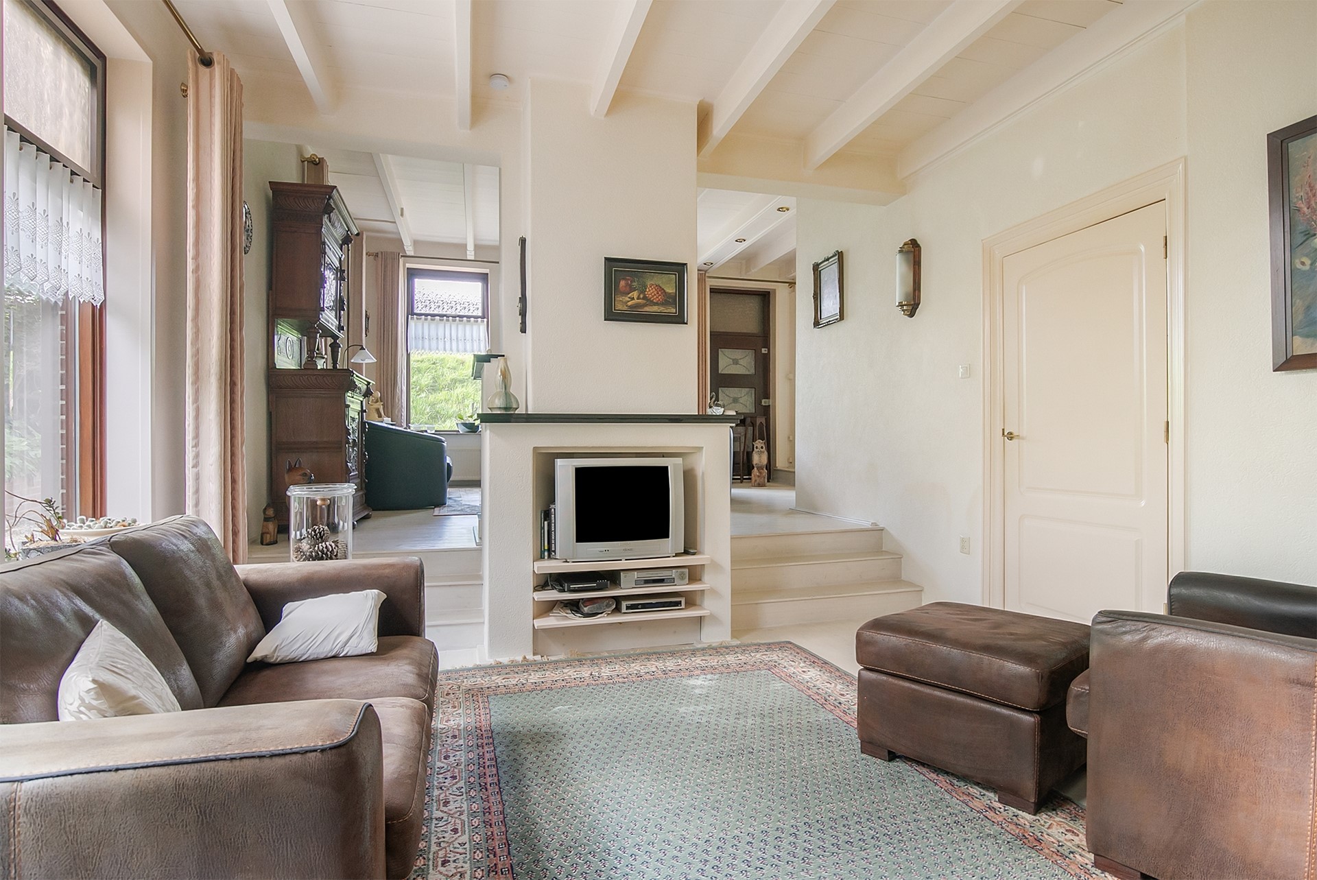 Via de hal komt u van de woonkeuken in de ruime woonkamer. Wat opvalt is het niveauverschil, het eiken balkenplafond en de vele raampartijen, waardoor u optimaal kunt genieten van daglicht.