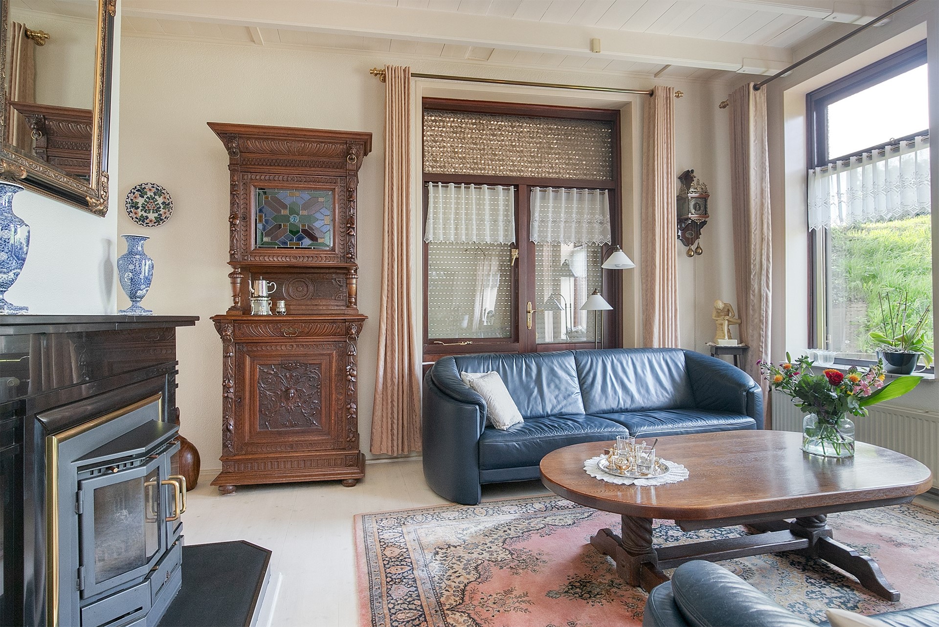 De schouw verdeelt de woonkamer in 2 gedeeltes, waardoor in het lager gelegen gedeelte een zitkamer is ontstaan voor wat meer privacy, en een ruim zit- en eetgedeelte, via 3 traptreden te bereiken. Dit gedeelte heeft 2 houtkachels, waarvan 1 kachel aansluit op de schouw in de keuken.