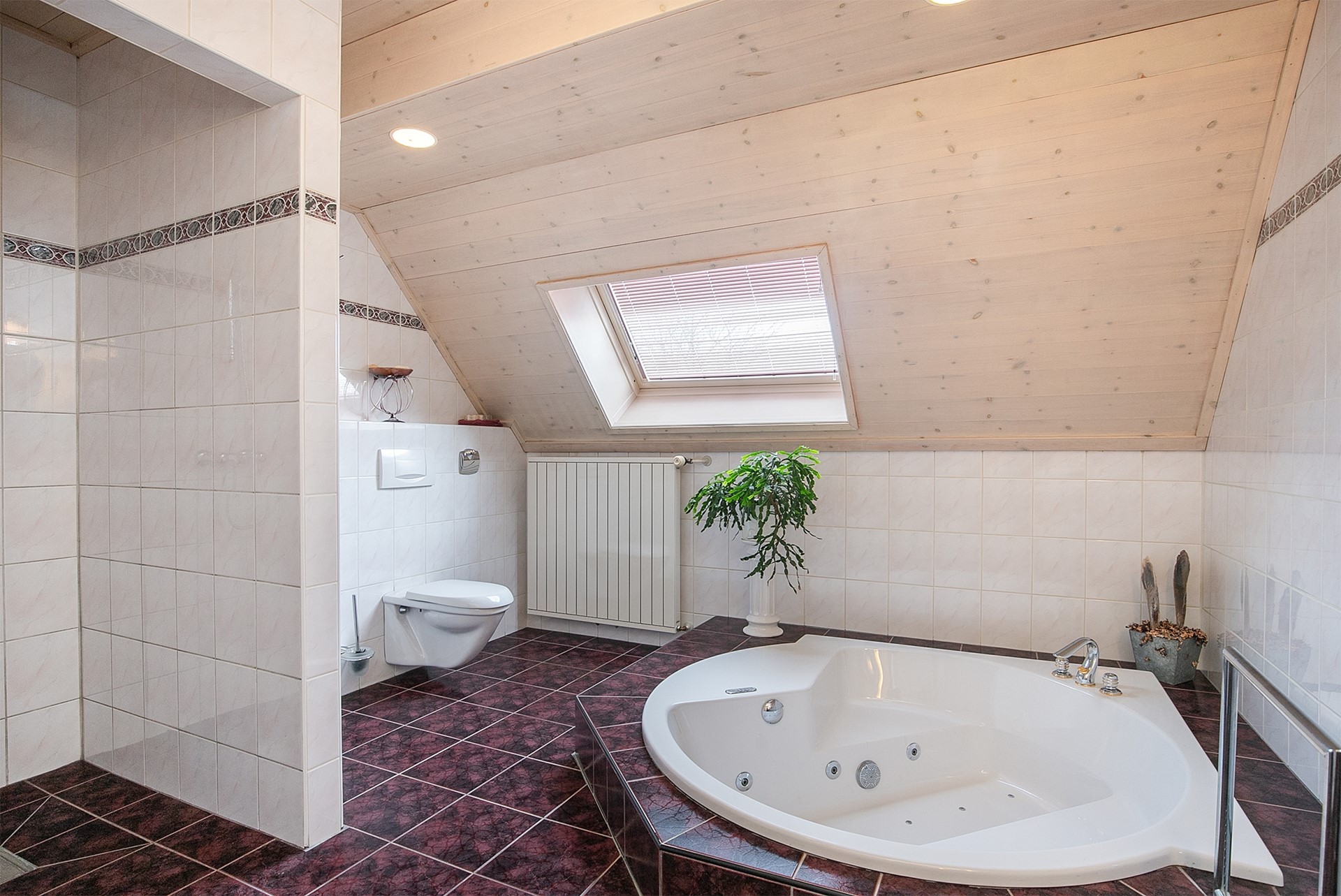 De badkamer heeft een luxe bubbelbad, inloopdouche, dubbele wastafel en toilet. Het daglicht komt binnen via een Velux dakraam.