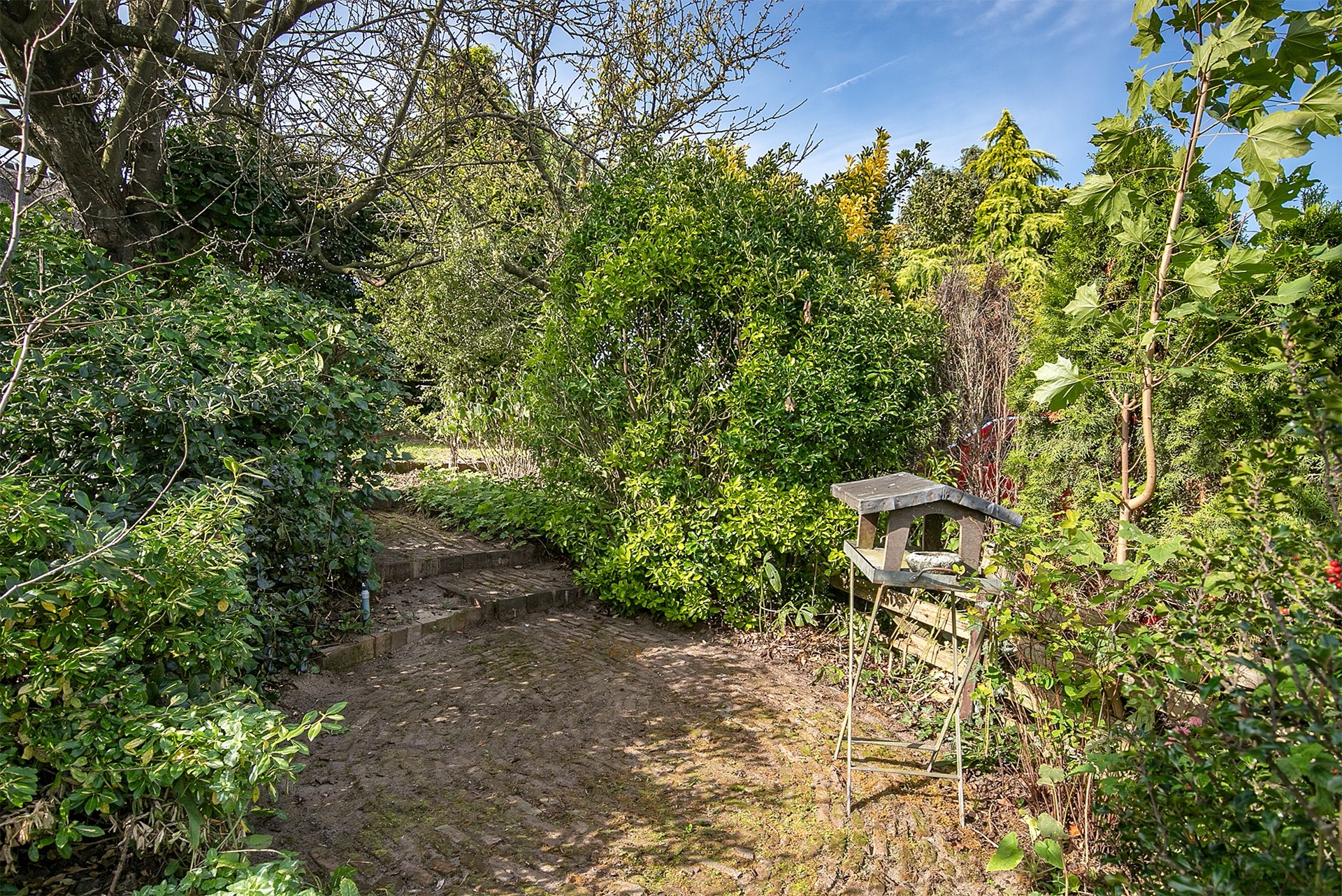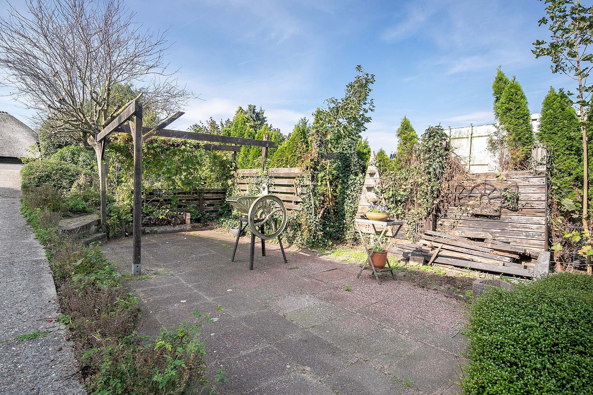 Het perceel is middels een oprit naar een naast gelegen perceel gesplitst. De tuin is aangelegd met een terras, bomen en diverse struiken, alsmede een bewateringssysteem.