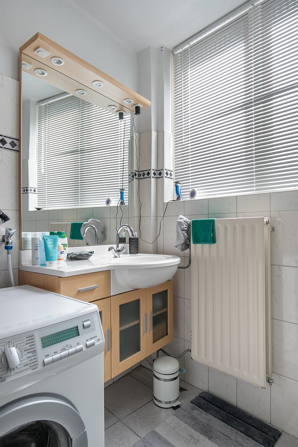 Op de eerste verdieping vindt u ook de badkamer. Deze beschikt over een wastafel, douche en toilet. De betegelde ruimte heeft ook centrale verwarming. Tevens is hier de aansluiting voor een wasmachine.