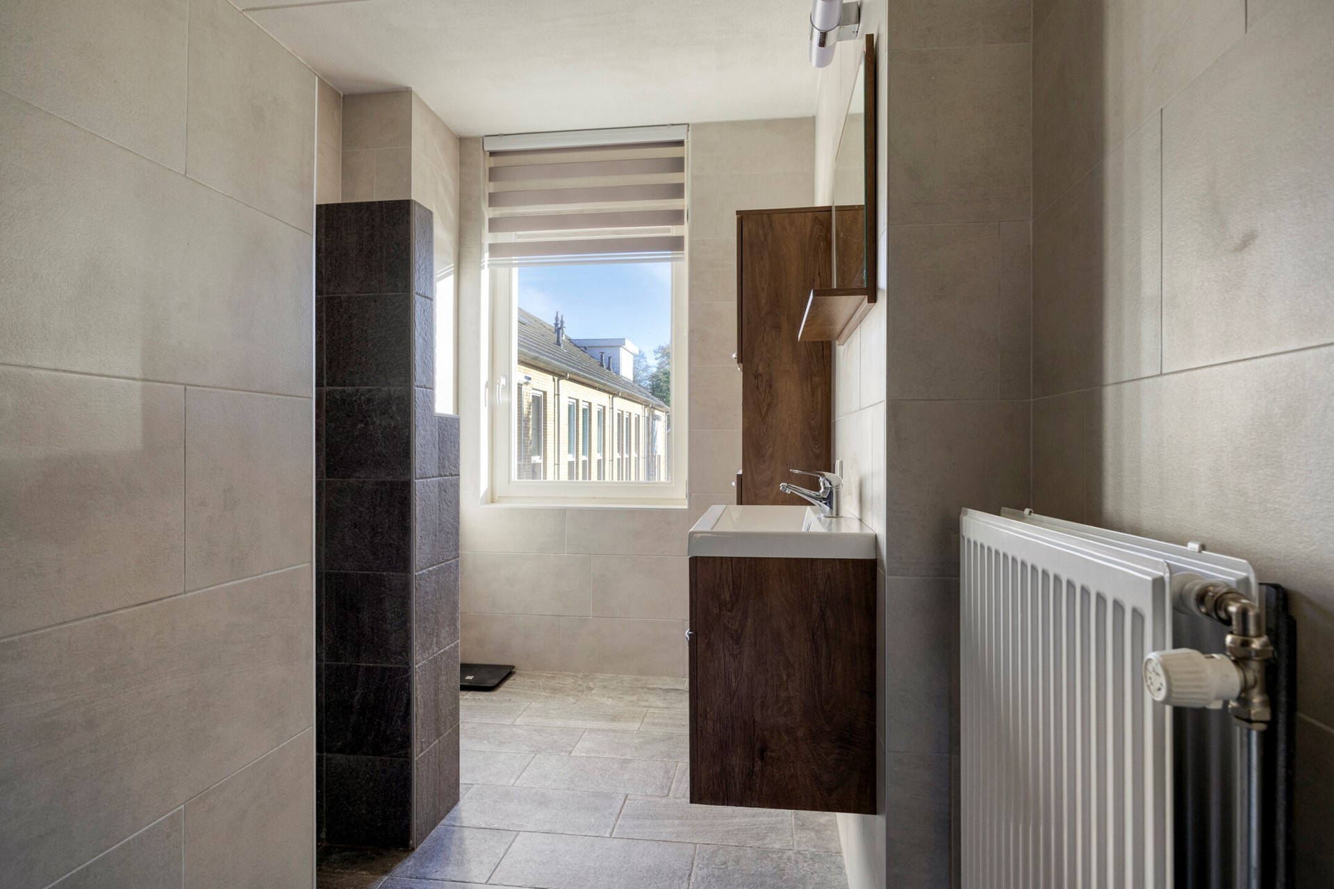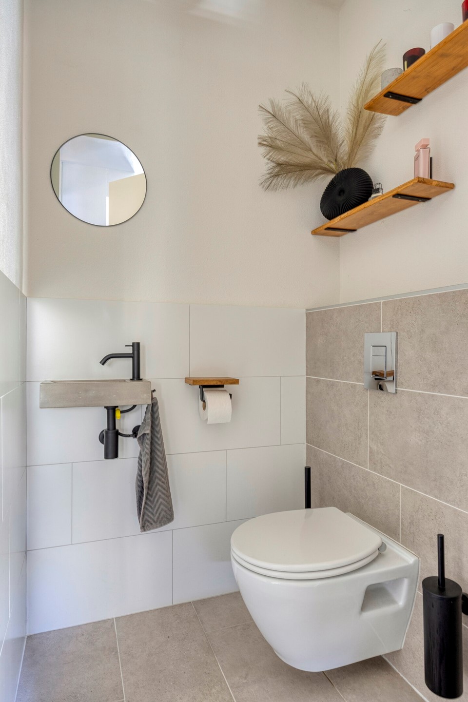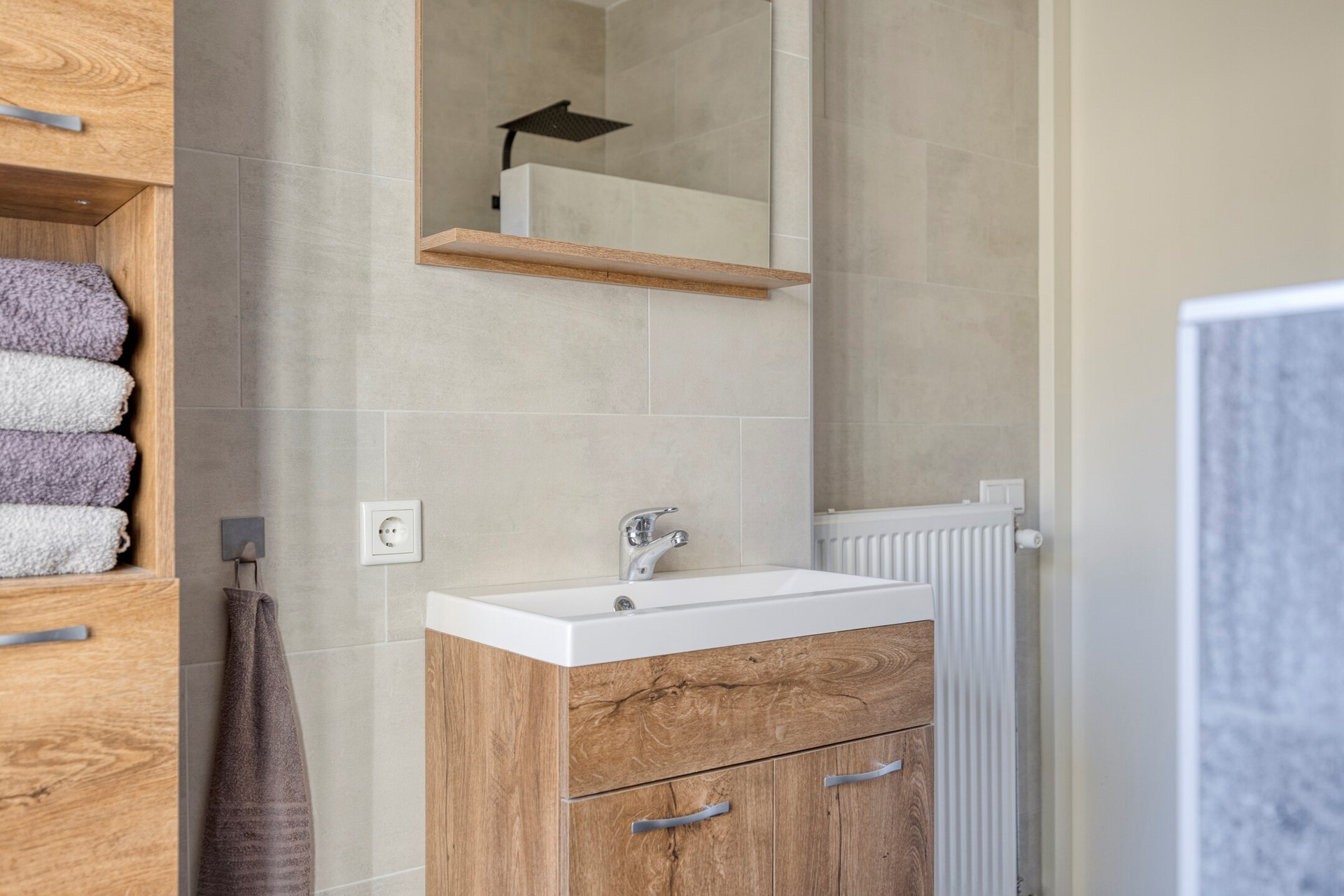 De badkamer is een plaatje op zich. Stijlvol betegeld met een combinatie van ruwe en strakke tegels, wat zorgt voor een moderne, maar toch warme uitstraling. Het houten wastafelmeubel en de bijpassende kasten brengen extra sfeer. En dan die heerlijke douche! Met de royale zwarte regendouche en het handige muurtje om op te zitten is dit een plek om écht even te ontspannen.