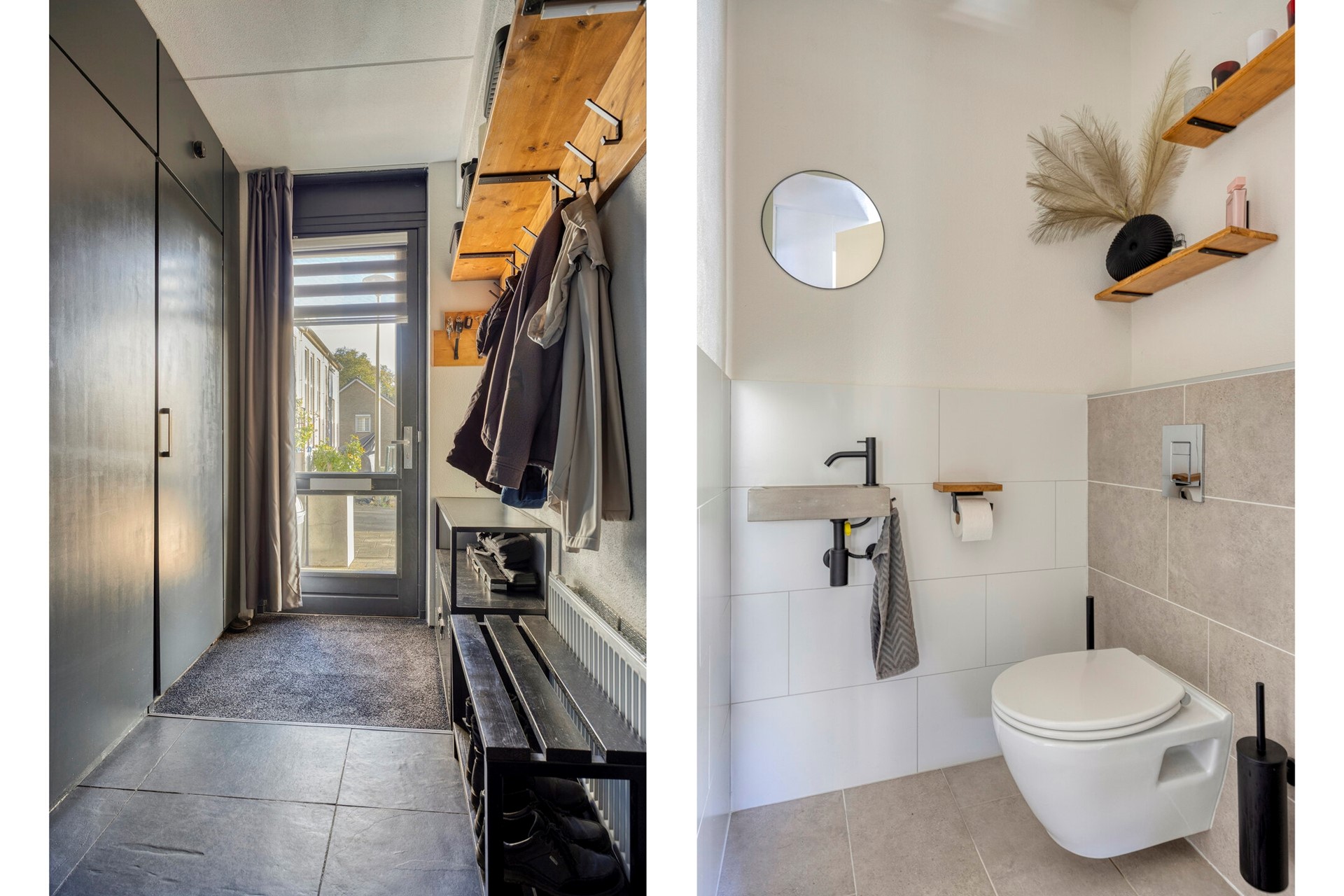 In de hal vind je verder de trap naar boven en het moderne, smaakvol afgewerkte toilet en de doorgang naar het leefgedeelte. Op de vloer ligt een mooie leistenen vloer die doorloopt over de hele benedenverdieping en zorgt voor een stoere rustige basis.