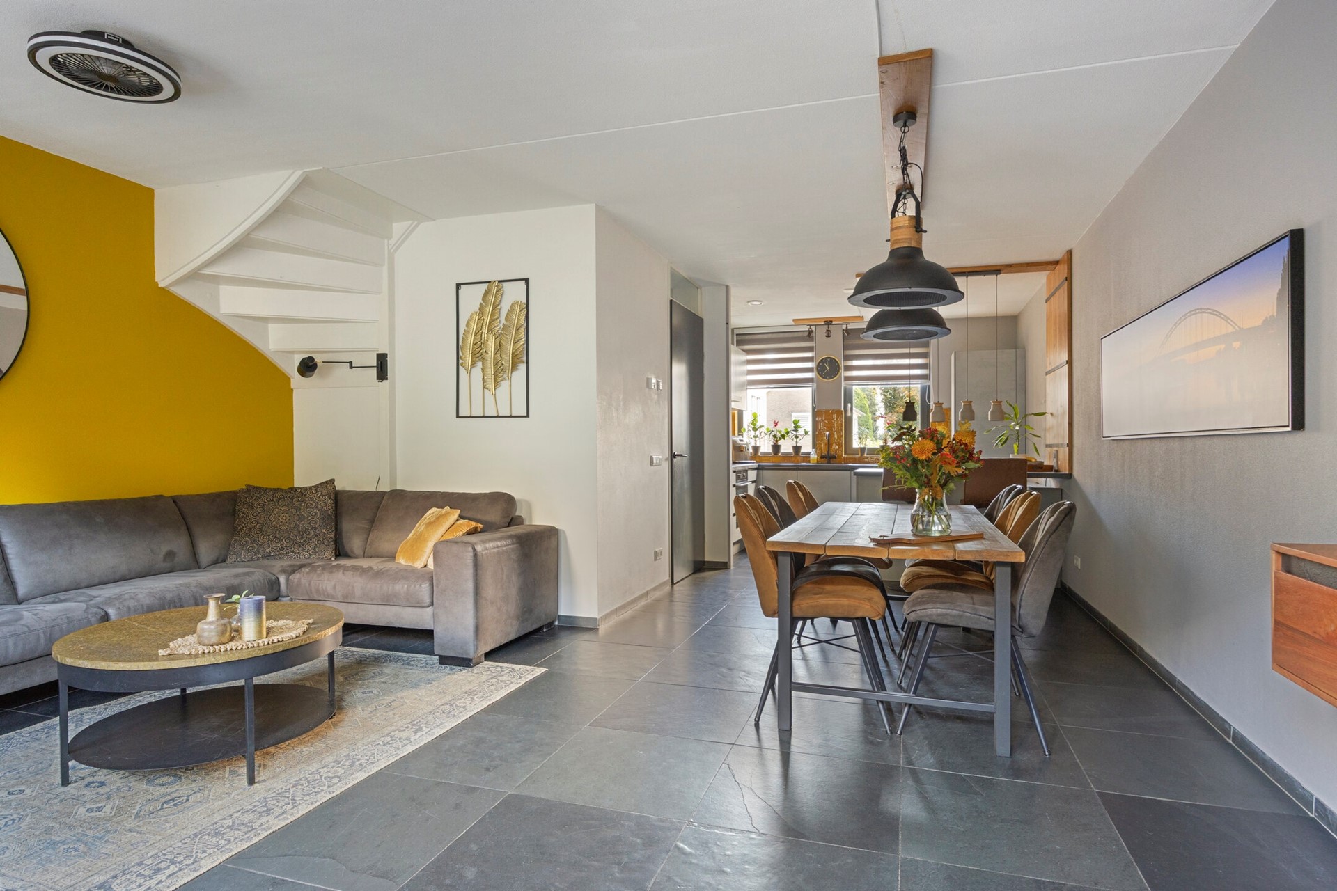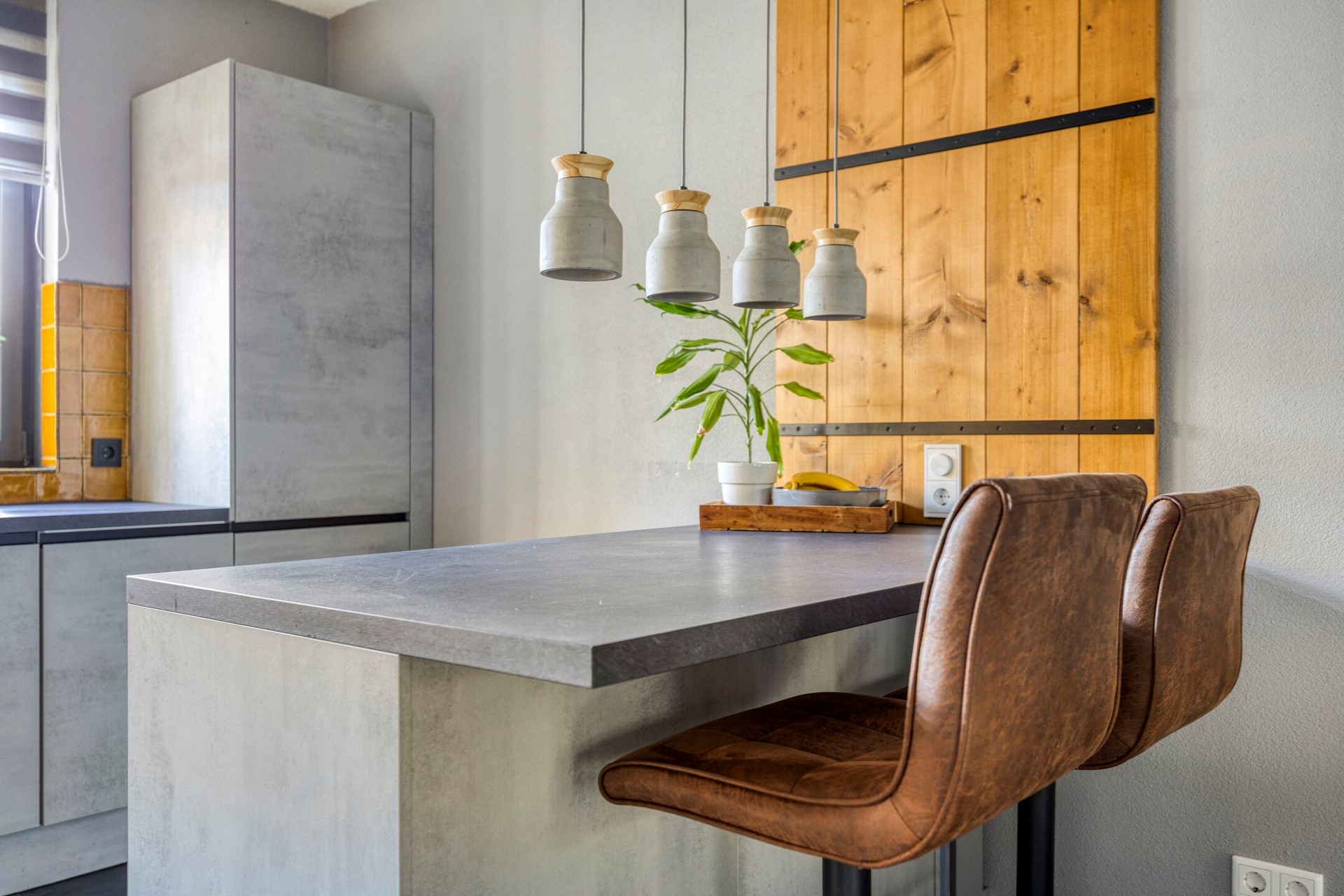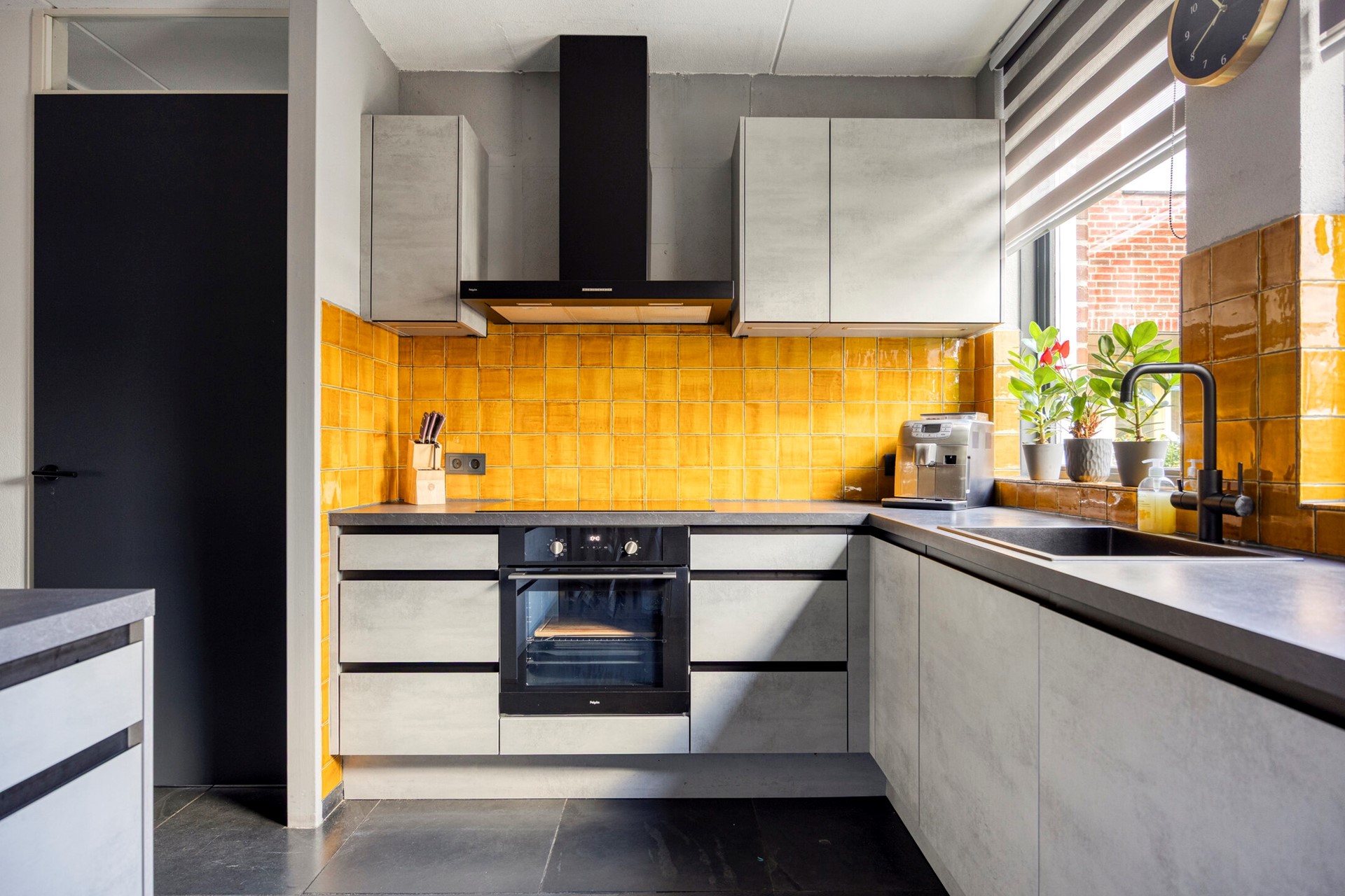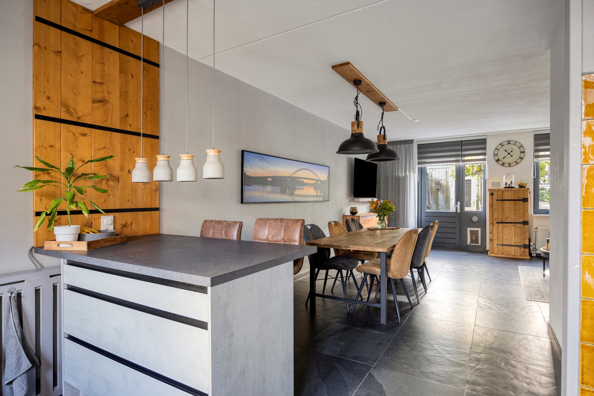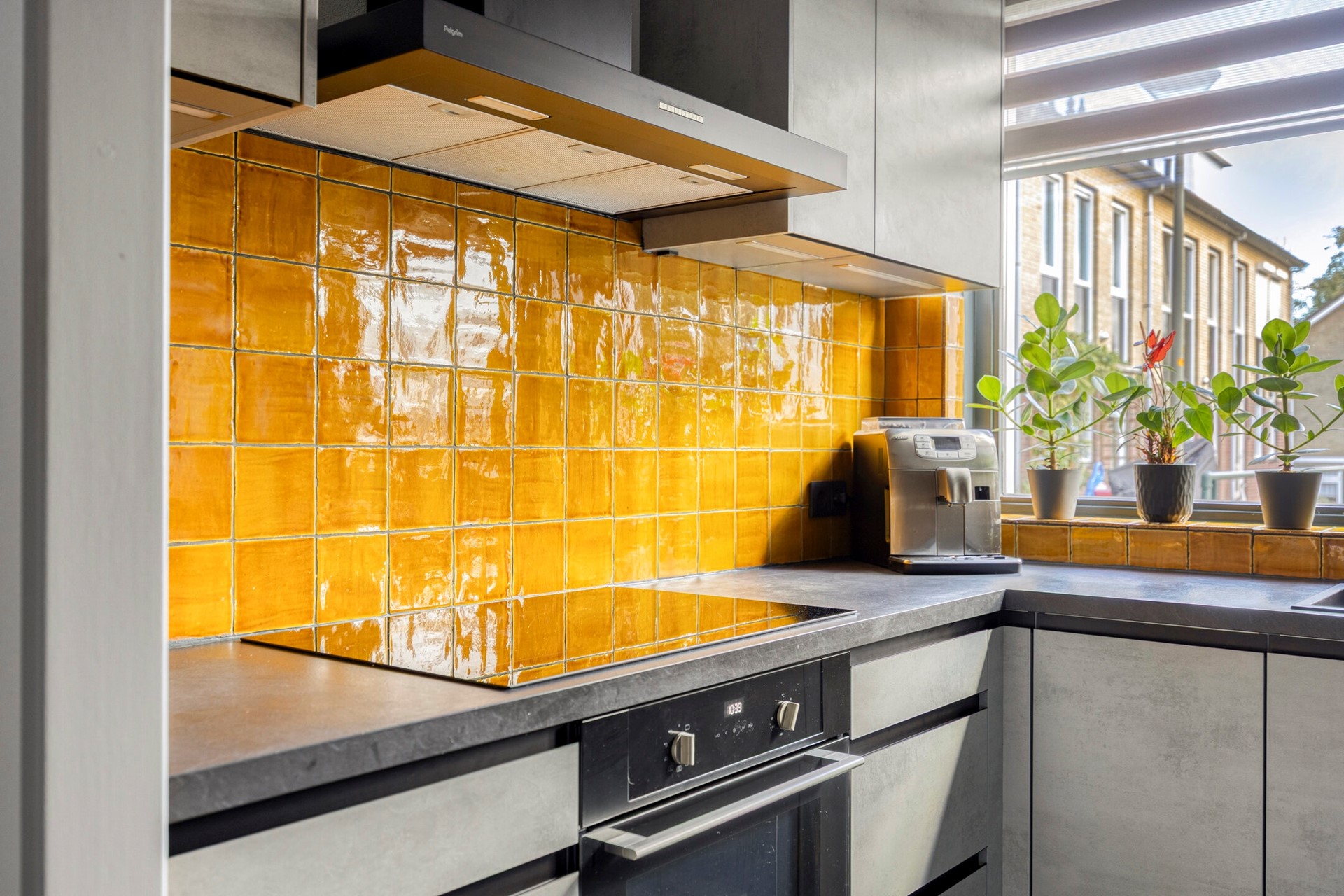 In het leefgedeelte bevindt zich aan de voorzijde de moderne keuken met een gezellig schiereiland. Dé plek voor de eerste kop koffie van de dag! De keuken is opgesteld in een praktische L-vorm en voorzien van alle gemakken, een kokendwaterkraan, oven, vaatwasser en inductiekookplaat. De kastfronten hebben een stoere betonlook en de opvallende kleurrijke tegeltjes voegen een vrolijk, eigen karakter toe. Hier zie je dat er echt gevoel is voor styling!