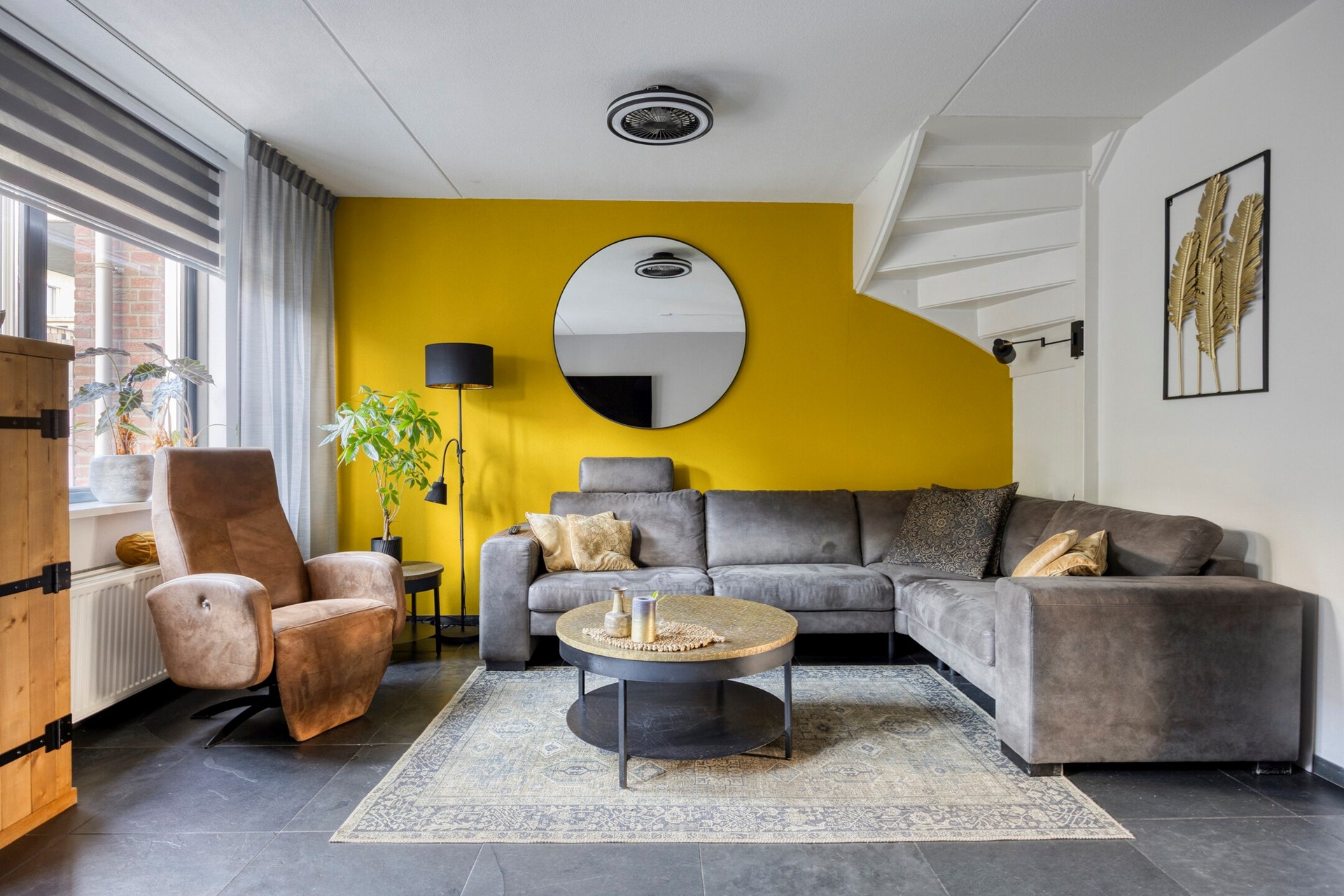 De woonkamer aan de achterzijde voelt warm en knus aan, met genoeg ruimte voor een fijne zithoek. Vanuit hier kijk je uit op de tuin en loop je via de achterdeur zo naar buiten.
