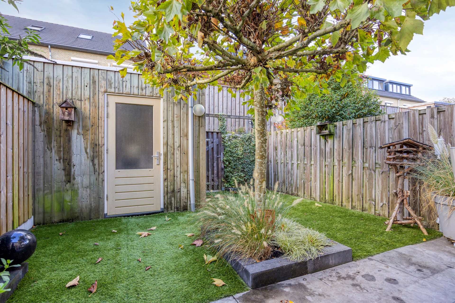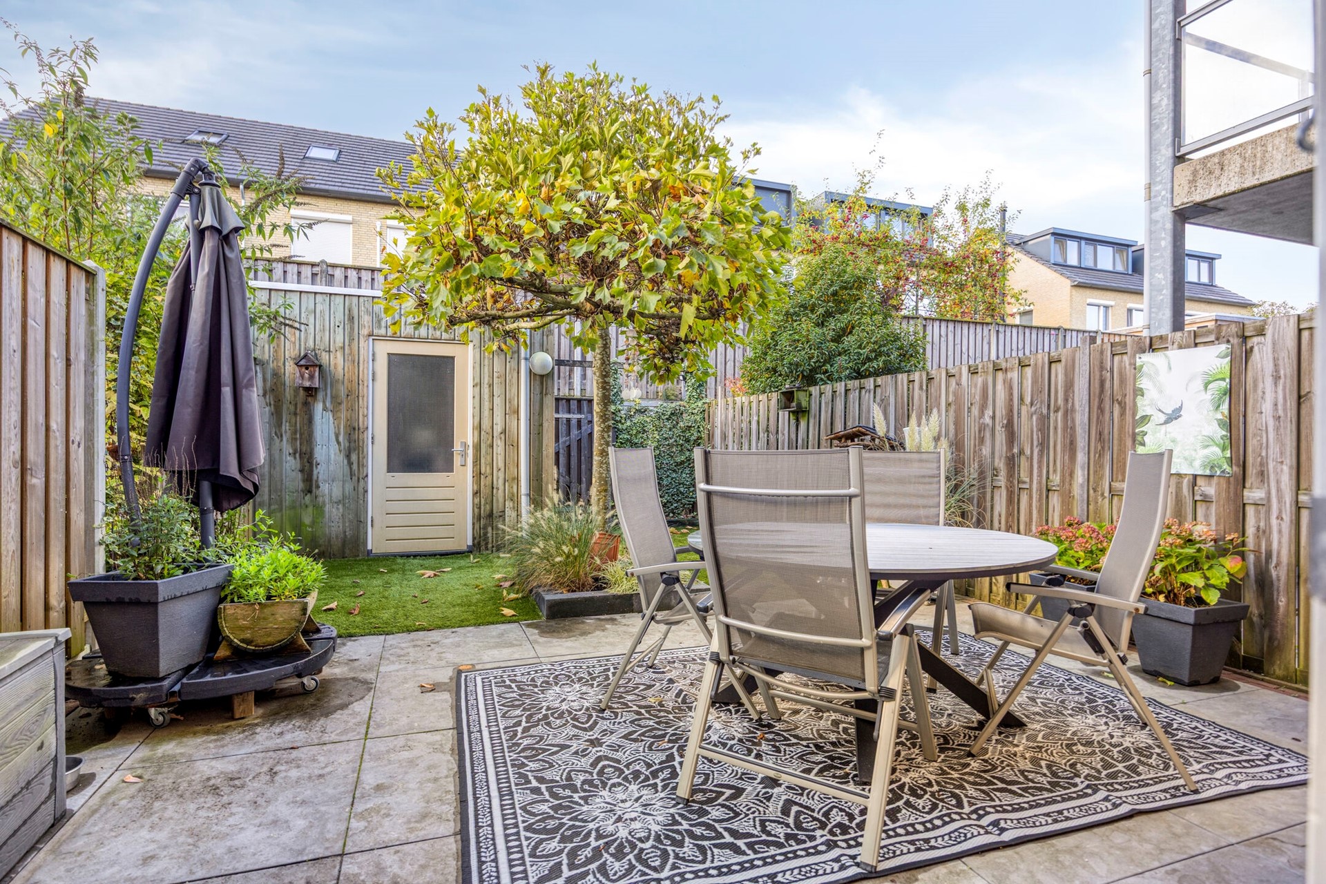 De tuin is een heerlijke plek om te ontspannen. De achterzijde van de woning is voorzien van een zonnescherm, zodat u op een warme zonnige dag ook uit de zon kunt zitten. Met een groene kunstgrasstrook, een sfeervolle boom met border en een terras met ronde eettafel is dit een fijne mix van gezelligheid en rust.