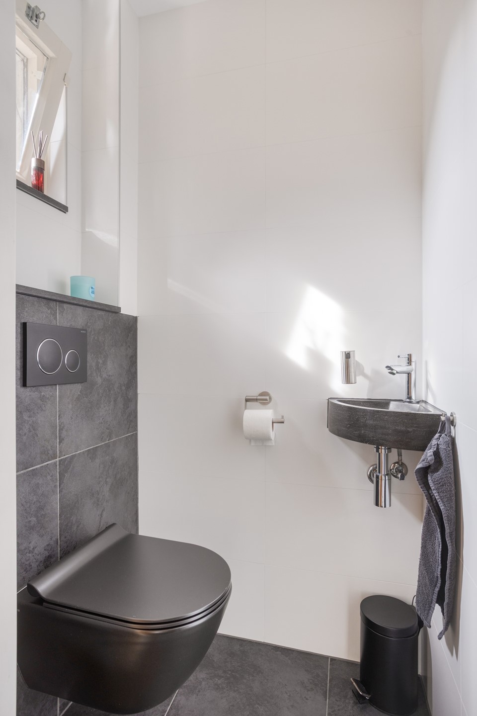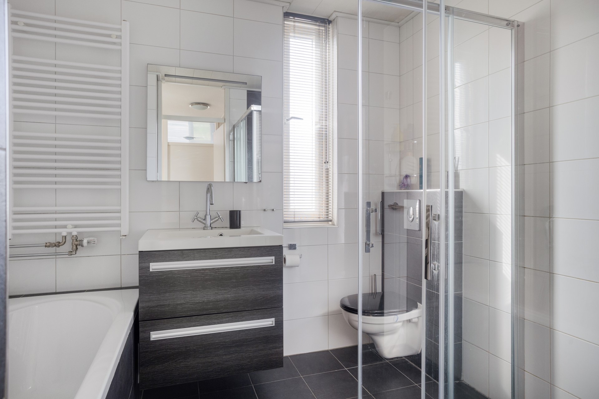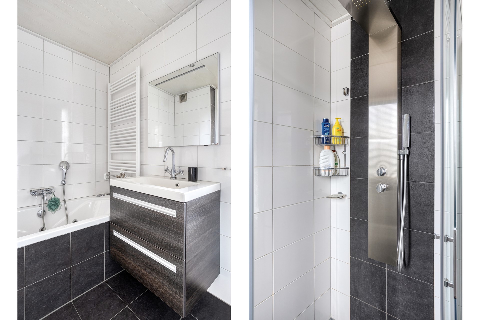 De badkamer is modern en goed ingedeeld. Tijdens de renovatie in 2020 is de indeling hiervan aangepakt, waardoor er plek is voor zowel een luxe bubbelbad een ruime douche en toilet. Een modern wastafelmeubel biedt opbergruimte, en de strakke afwerking zorgt voor een eigentijdse uitstraling.