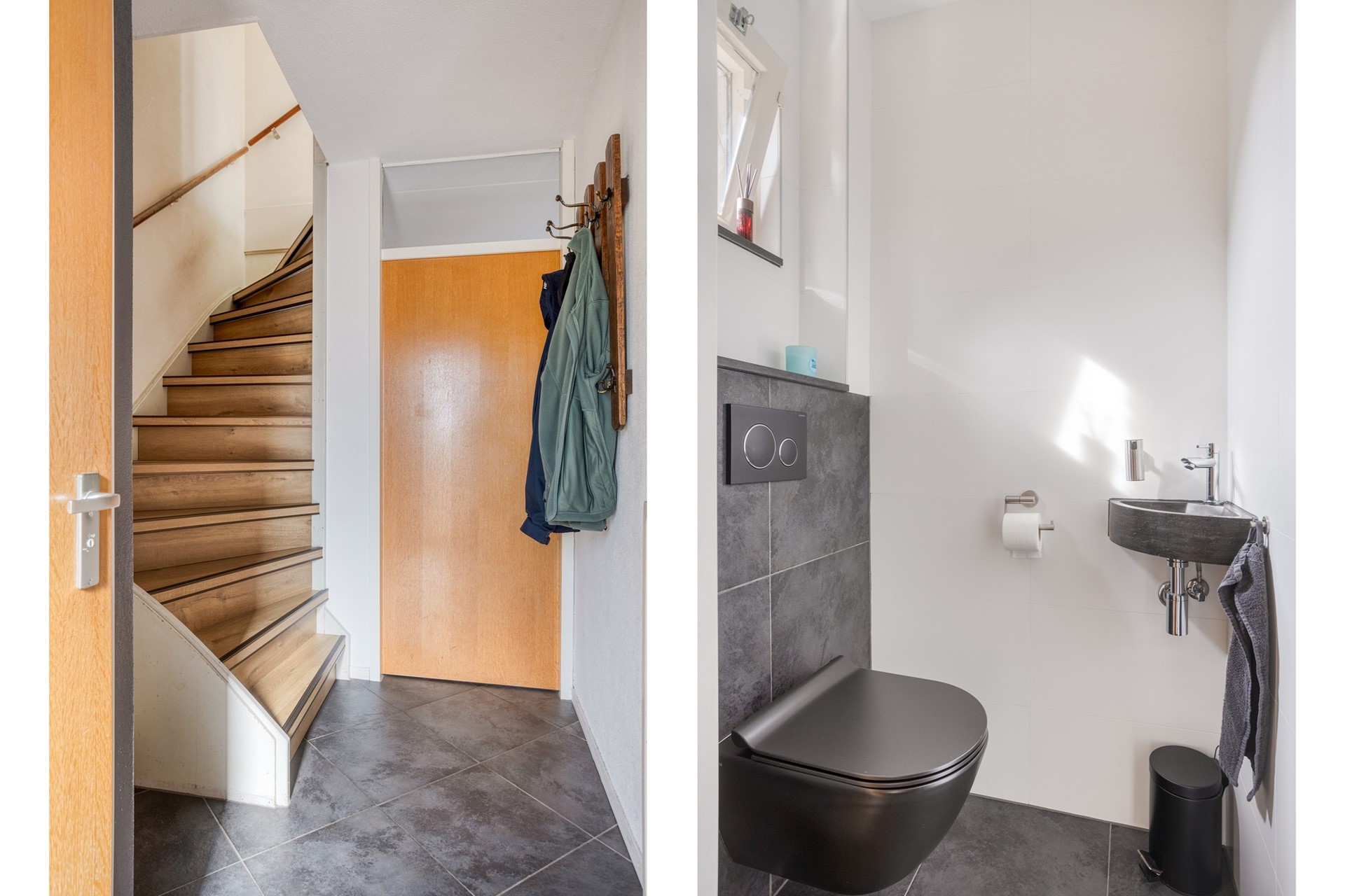 Deze lichte en energiezuinige woning biedt alles wat je nodig hebt om je hier thuis te voelen. De hal is praktisch ingedeeld met toegang tot het moderne toilet, meterkast en de trapopgang naar boven. De plavuizen vloer hier loopt door naar het leefgedeelte wat rust en eenheid in het geheel geeft.