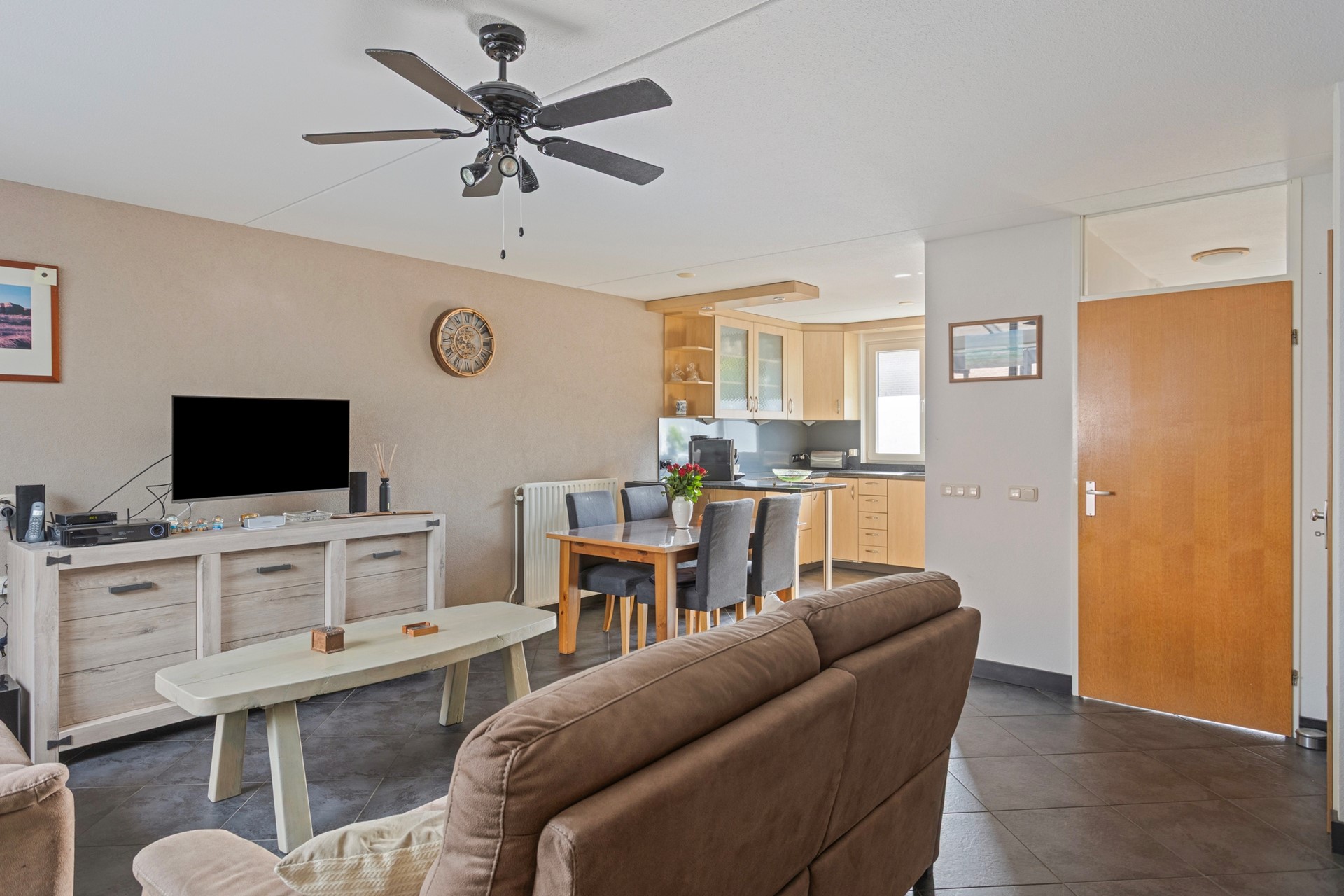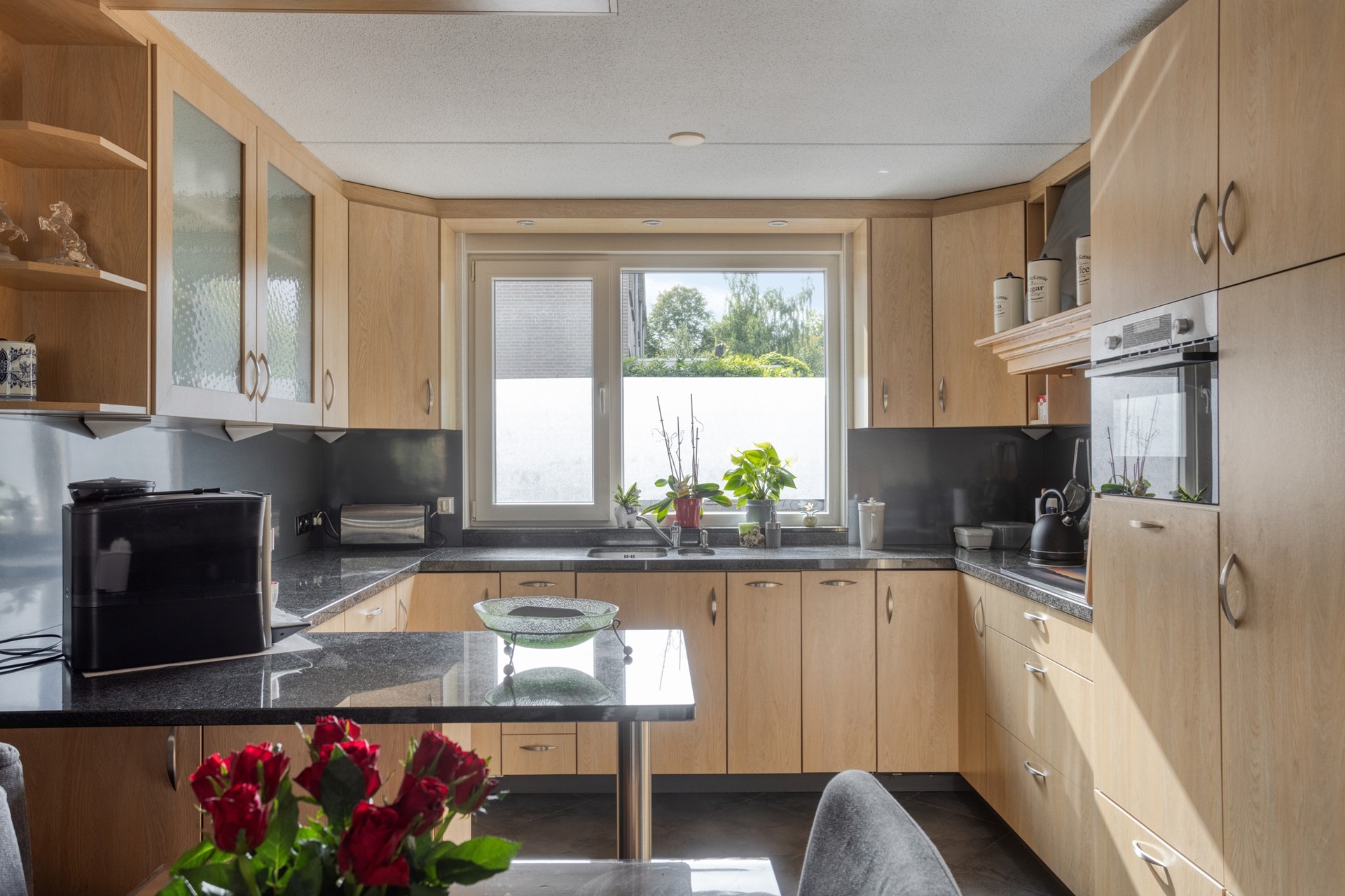Dat voel je in de woonkamer, die dankzij de schuifpui mooi in verbinding met het overdekte terras staat. De open keuken aan de voorzijde is ingericht met moderne inbouwapparatuur zoals een kookplaat, oven, koelkast en een vaatwasser op hoogte. Hierdoor heb je alles bij de hand voor een efficiënte dagelijkse routine.