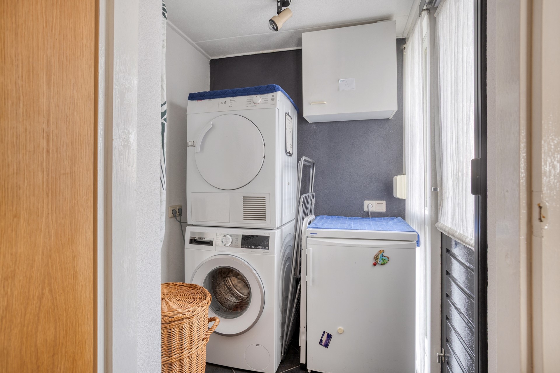 De bijkeuken aan de achterzijde is functioneel te gebruiken, met zowel aansluitingen voor de witgoed apparaten als de toegang tot het overdekte terras.