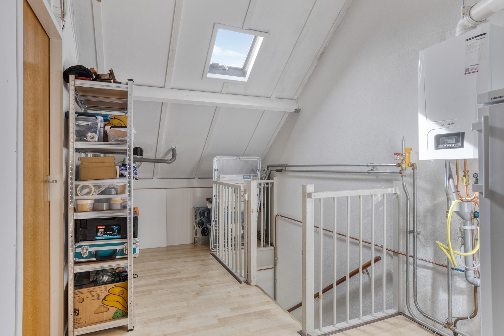 En alsof dat nog niet genoeg is, biedt de zolder een zee aan mogelijkheden. Heb je behoefte aan nog een extra slaapkamer, een creatieve werkruimte of een praktische berging? Hier kun je het allemaal realiseren. Op de voorzolder tref je bovendien de technische voorzieningen, zoals de cv-ketel en de omvormer van de zonnepanelen, wat past bij de duurzame uitstraling van deze woning.