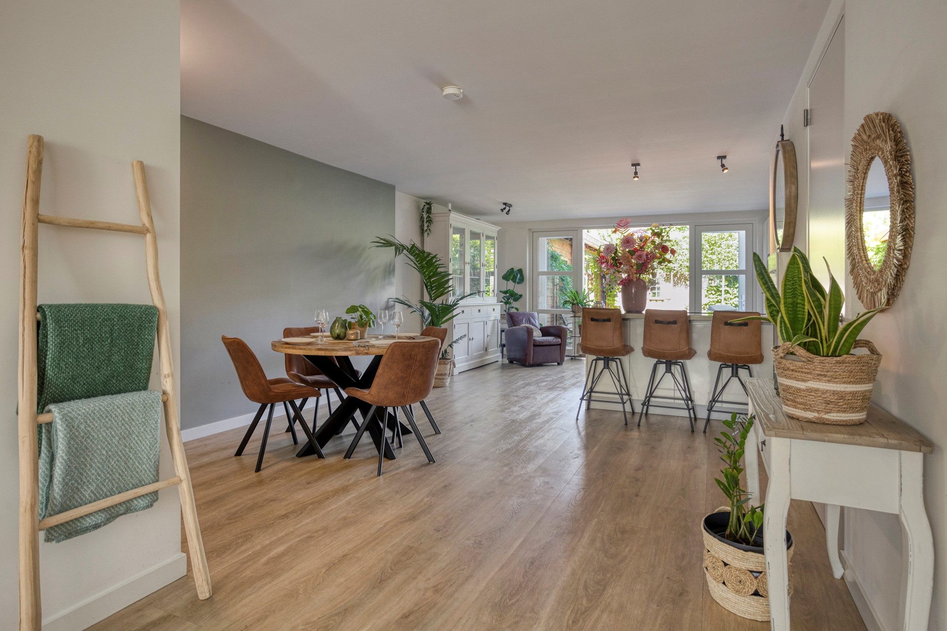 Naast de eetkamer bevindt zich een lange hal met toegang tot de tuinkamer. Deze tuinkamer is aangebouwd tegen de buitengevel en kan aan de voorzijde volledig worden afgesloten, waardoor er een extra woonruimte ontstaat. De tuinkamer is uitgerust met een extra keukenblok voorzien van warm en koud water, een airco, een tv-aansluiting en een vloer van moderne zwart-grijze keramische tegels, wat zorgt voor een strakke uitstraling.