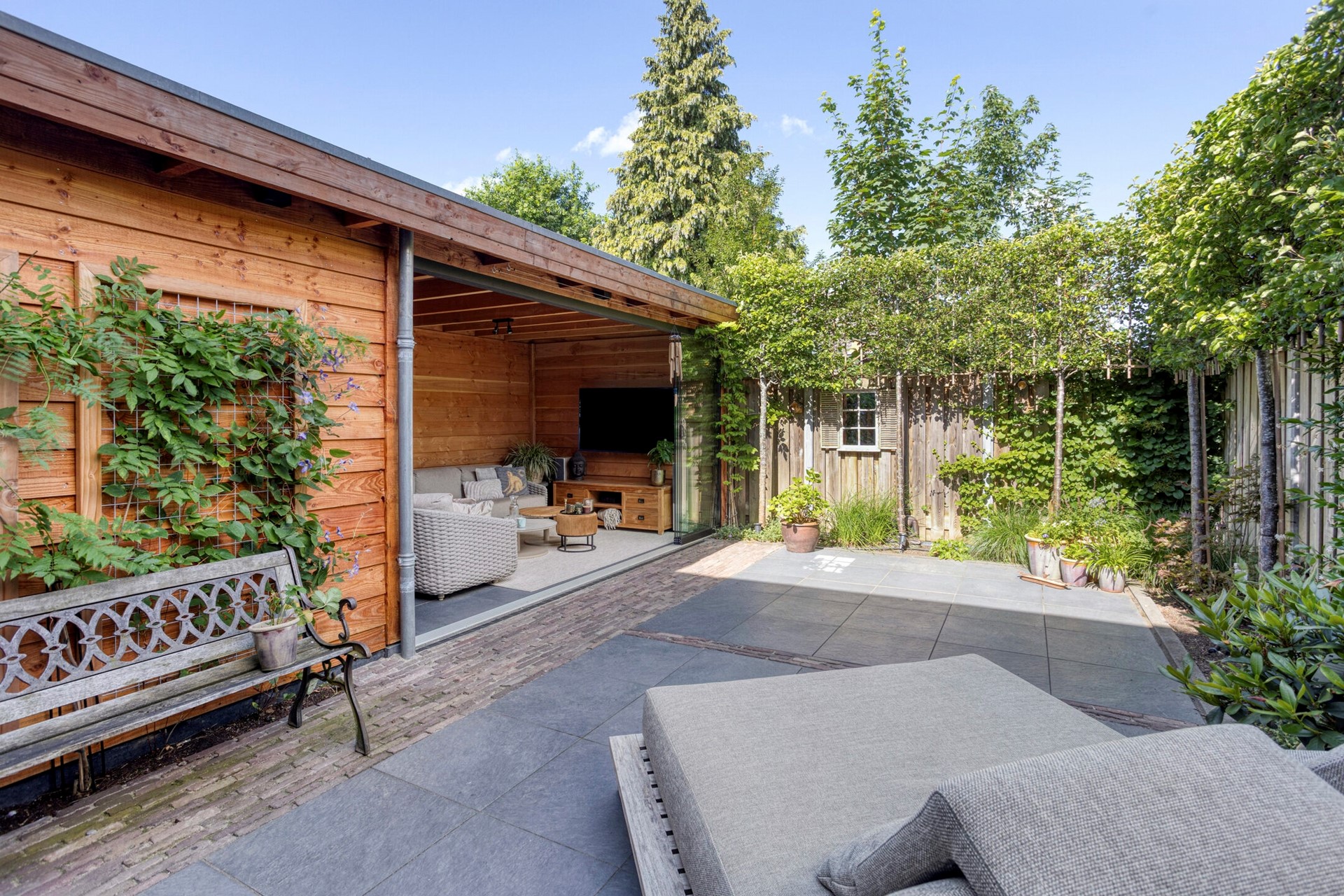 Via dubbele openslaande deuren in de woonkamer bereik je de strak ingerichte tuin. Deze is onderhoudsvriendelijk aangelegd met dezelfde keramische zwart-grijze tegels als in de tuinkamer en smal straatwerk. Langs de randen zorgen borders met leibomen en diverse groenpartijen voor een sfeervol geheel.
