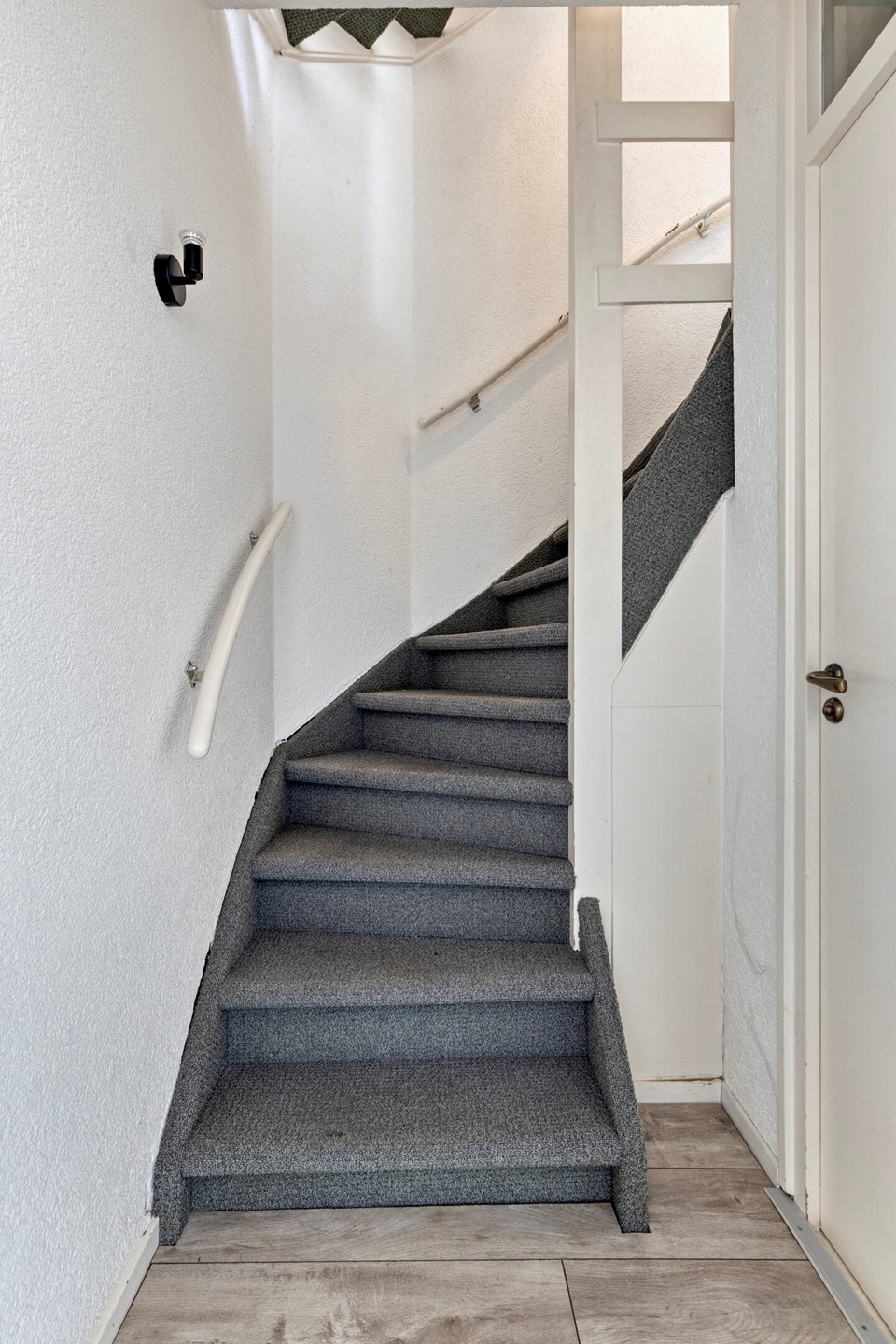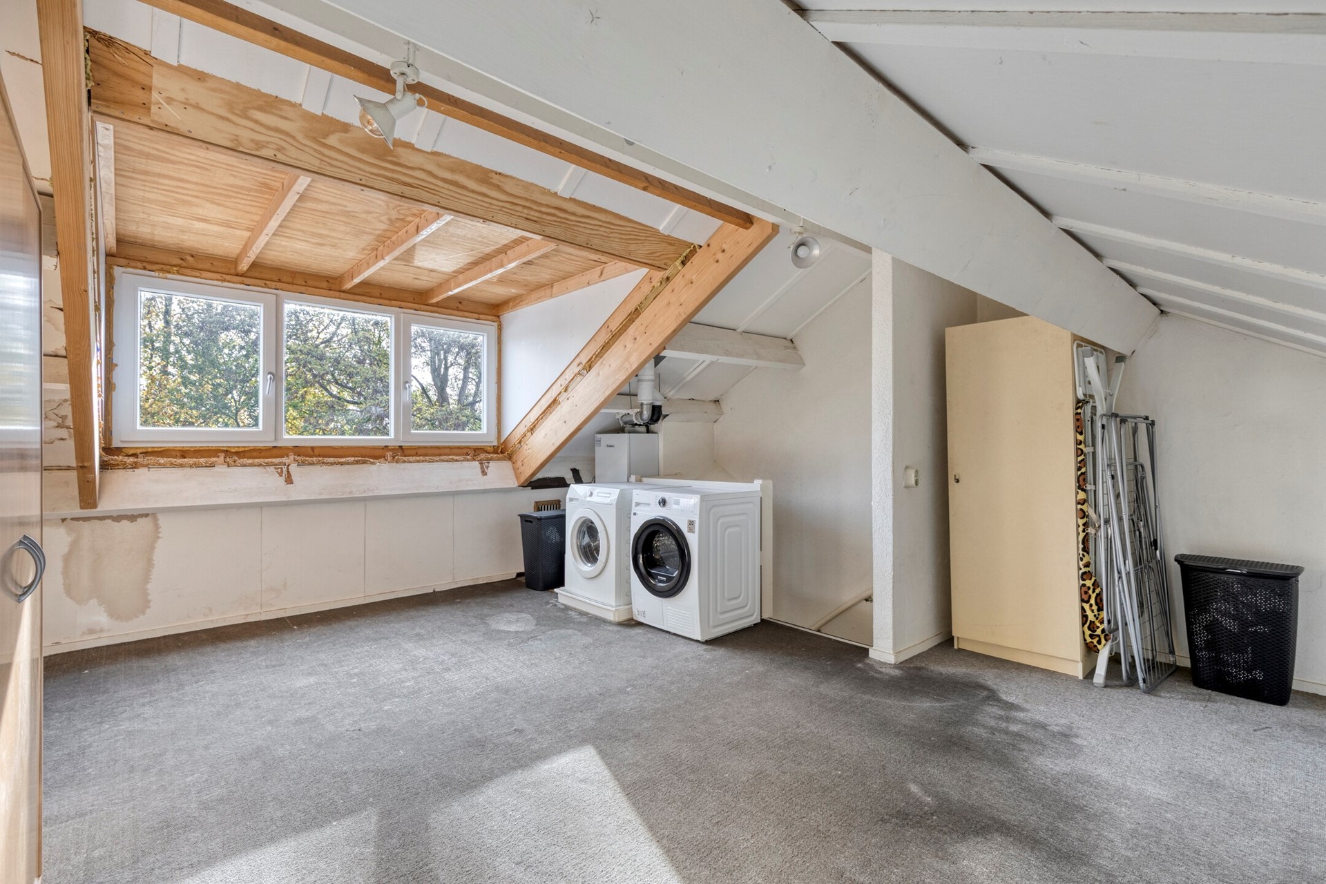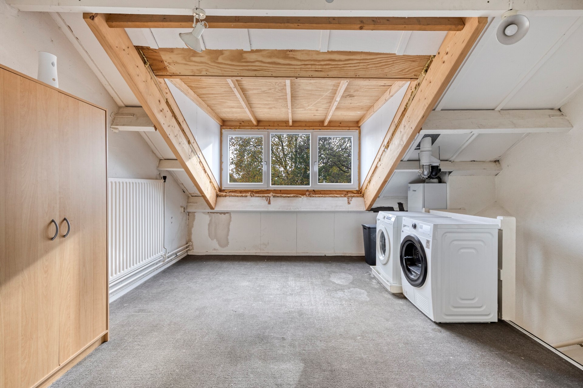Via de vaste trap bereik je de tweede verdieping. Hier vind je de derde slaapkamer met dakkapel, wat zorgt voor extra ruimte en licht. Daarnaast is er nog plaats voor de wasmachine en droger, plus extra bergruimte onder de schuine kanten van het dak.