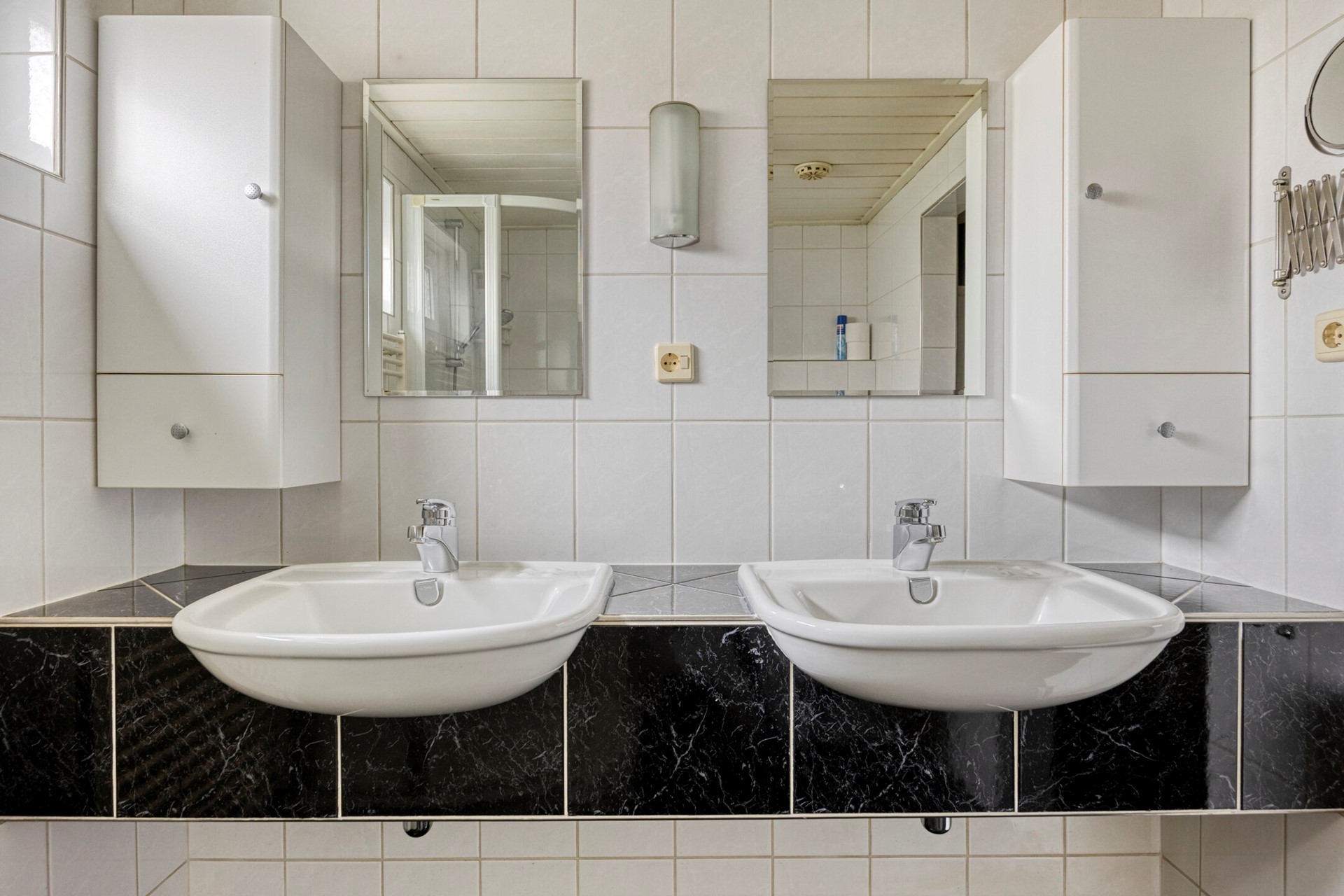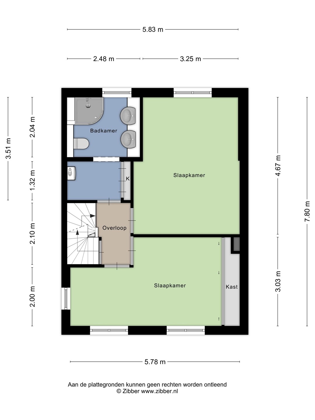 De overloop biedt toegang tot twee bijzonder ruime slaapkamers, de badkamer en de trapopgang naar de tweede verdieping. Beide slaapkamers zijn groot genoeg om eventueel op te splitsen in meerdere kamers. De slaapkamer aan de voorzijde beschikt daarnaast nog over veel ingebouwde kastruimte. De badkamer is eveneens royaal van formaat, volledig betegeld en voorzien van een dubbele wastafel, douche, hangtoilet en een designradiator. Ook hier vind je extra kastruimte en de opstelling van de cv-ketel. Aan de voorzijde zijn de kozijnen nog voorzien van enkel glas, aan de achterzijde is dubbel glas aanwezig (mede door de aanbouw aan de achterkant).