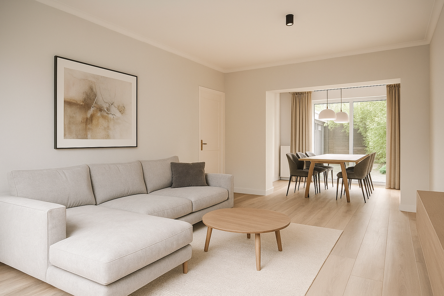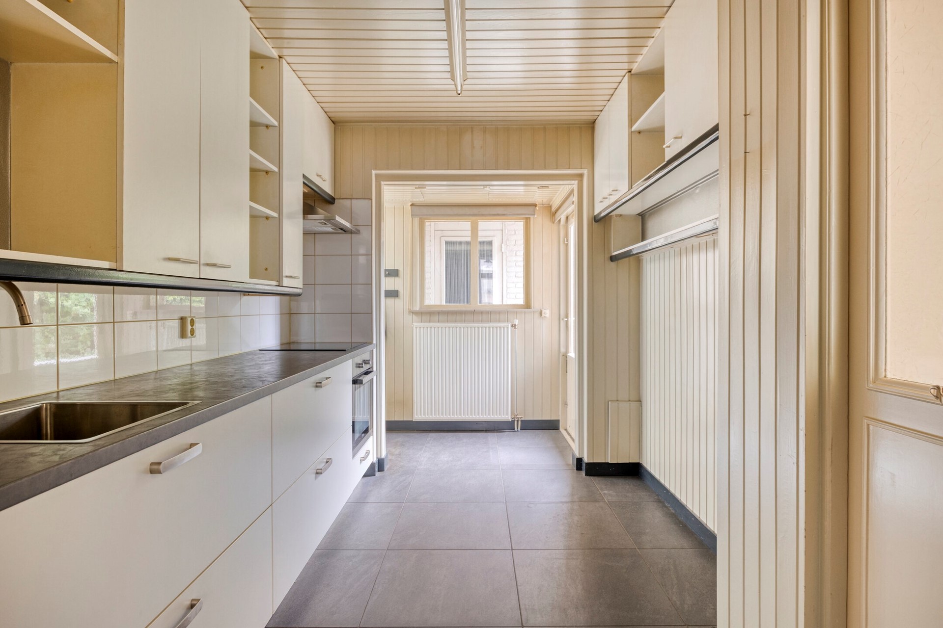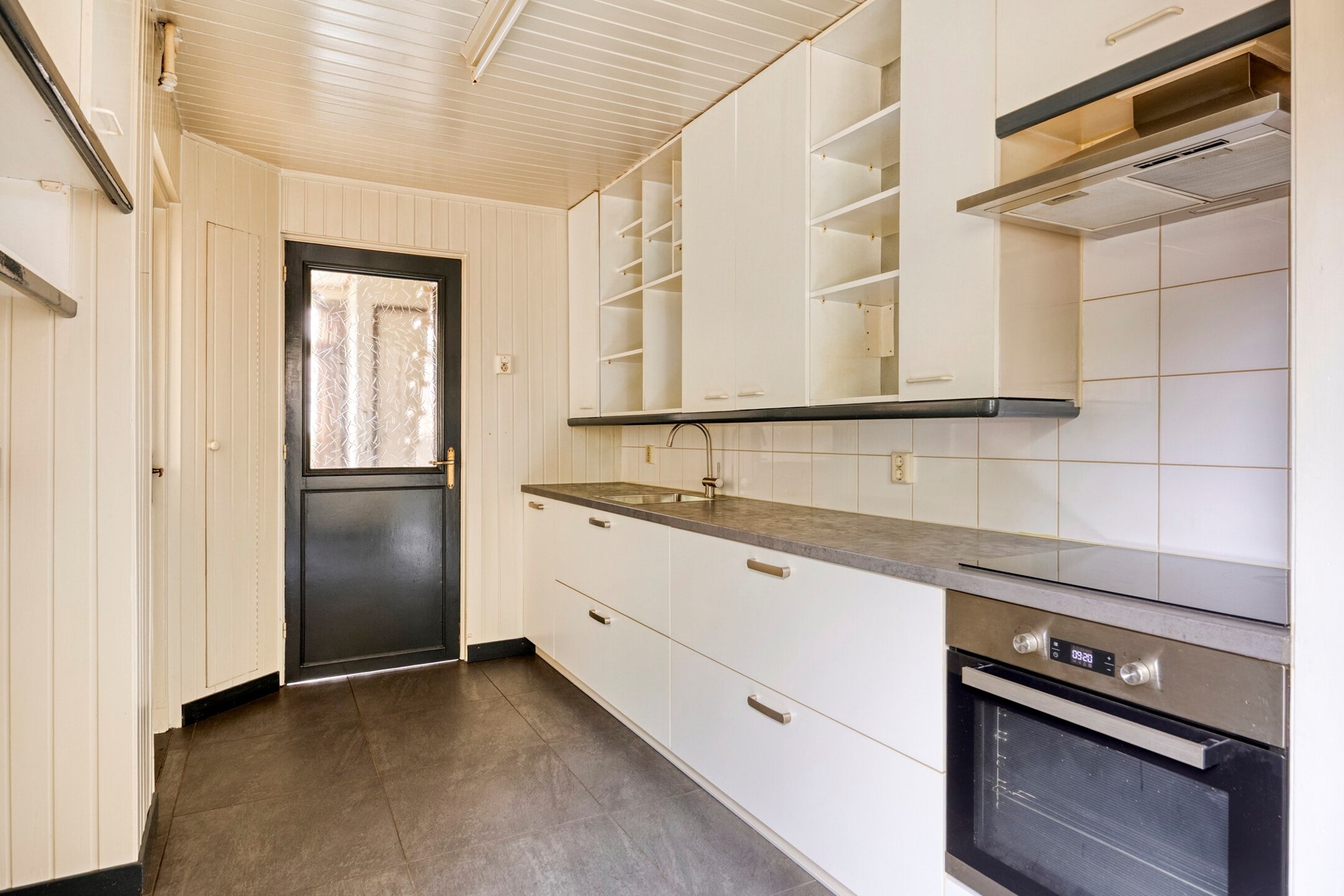 Via de entree kom je in de hal met toilet, garderobe en trapopgang naar de eerste verdieping. Daarnaast zijn er twee praktische kasten: één kelderkast met meterkast en nog een ingebouwde kast. De keuken is eenvoudig ingericht maar voorzien van een 4-pits inductiekookplaat, afzuigkap en kraan. Er is ook hier veel kastruimte en het onderblok dateert uit 2018. Vanuit de keuken heb je toegang tot zowel de woonkamer als de achtertuin. Ook bevindt zich hier de aansluiting voor wasmachine en droger. De doorzonwoonkamer is ruim en licht, met voldoende plek voor een zit- en eethoek. Een oude schouw en kachelaansluiting herinneren aan de vroegere indeling en geven de kamer karakter. Via de schuifpui loop je zo de achtertuin in. Op de vloer ligt een lichte laminaatvloer, terwijl de hal en keuken zijn afgewerkt met strakke grijze tegels.